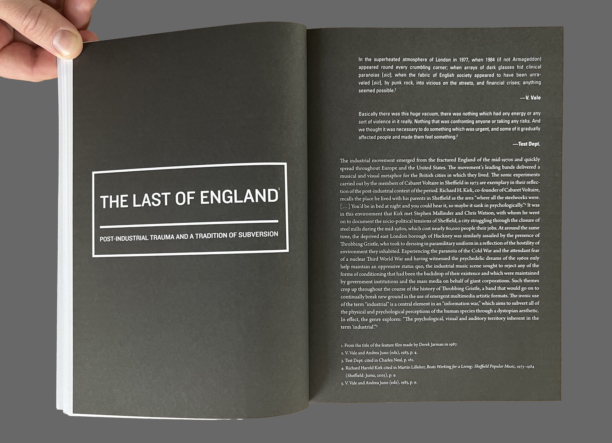 An exploration of the multidisciplinary creative culture encapsulated by the industrial scene, spanning musical, visual, multimedia, and performance arts. Industrial music appeared in the mid-1970s, and far from being a simple sound experimentation phenomenon, it quickly spawned a coherent visual culture operating at the intersection of a multitude of media (collage, mail art, installation, film, performance, sound, and video), and initiated a close inspection of the legacy of modernity and the growing pervasive influence of technology.